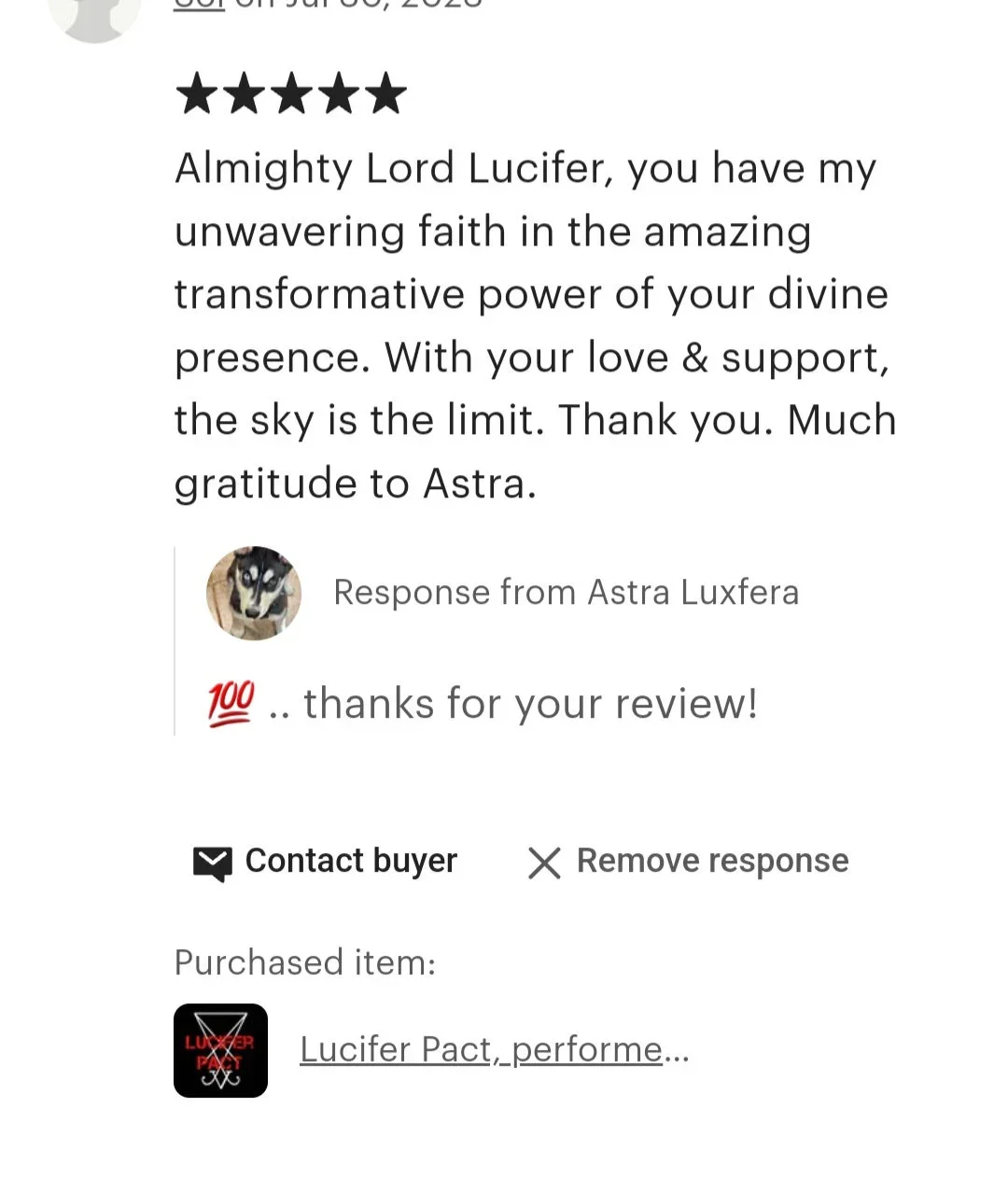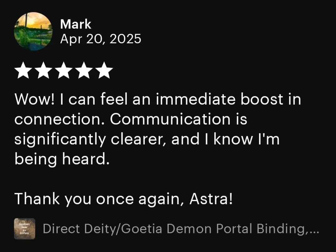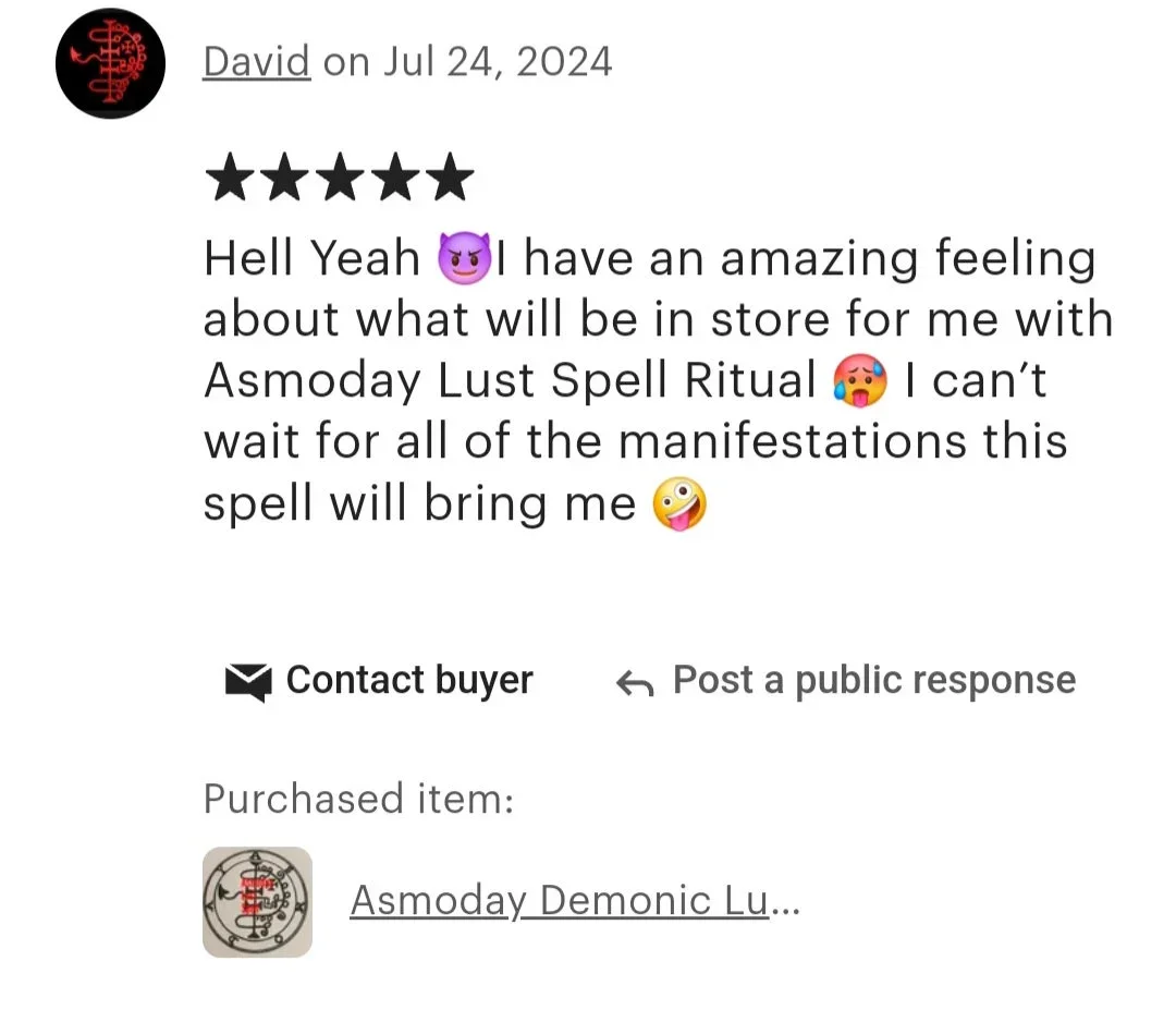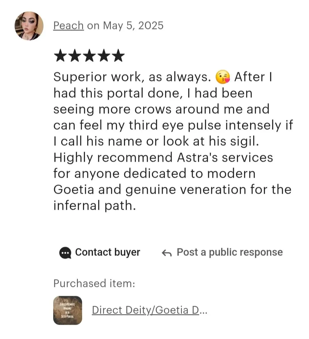 Santa Muerte Ancestor Connection Spell $250.00 Nyx Underworld Connection Spell $250.00 NEW! Astaroth Spirit Communication Spell, tailored to Mediums, Ghost Hunters, and Spirit Keepers! $250.00 Retrieval/Rebinding of ONE spirit, Direct Binding ONLY to you or an item you have $50.00 Direct Deity Portal Binding- ANY DEITY OR DEMON OF YOUR CHOICE! $65.00 Goetia Demon Matching Service- ACCURATE Reading to find your best Goetia Demon match! $50.00 Ascended Lunar Fae Direct Binding LIMITED/ARTISANAL BINDING! Tier 3 Binding $600.00 Spirit Companion Sigil Service, Custom Spirit Sigil $35.00 Cupid/Eros Love Ritual, for a target or to attract a new lover $350.00 Buer Healing Spell, Demonic Healing Magick $250.00 Home Energy Clearing/ Entity Removal $400.00 7 Archangels Attunement, Angelic Awakening, Align yourself to the power of the 7 Archangels $250.00 Raphael Purification and Rejuvenation Ritual $250.00 Spirit Companion ETERNAL BINDING $350.00 Azazel Empowerment Ritual- Awaken YOUR Black Flame! $400.00 Decarabia Astral Projection Ritual- For even the most resistant person $250.00 POWERFUL Break Up Ritual with the help of Asmoday, Shemyaza and Lucifer $350.00 Apollo Musical Talent Ritual, Play ANY instrument to the highest capacity $250.00 Belial Pathfinding Ritual $250.00 Andras Revenge Curse- POTENT ruin curse $500.00 Bune Pact, ONE YEAR pact to CHANGE YOUR LIFE! $450.00 Asmoday Lust Ritual, MALE sexual dominance spell $250.00 Mammon Career Change Spell $250.00 Lucifer Pact $666.00 Fairie Luck Spell $250.00 Clauneck Money Ritual, POWERFUL financial road opener ritual $250.00 Haagenti Blockage Removal Ritual $250.00 Third Eye Activation $250.00 Aphrodite Beauty Spell $250.00 Energy Body Attunement, Clear Blockages, Open Chakras,Arcturian Energy Attunement, Arcturian Light Codes $250.00 Demonic Love Spell, 3 Demon Spell $350.00 Lilith Spell of Youthful Essence $250.00